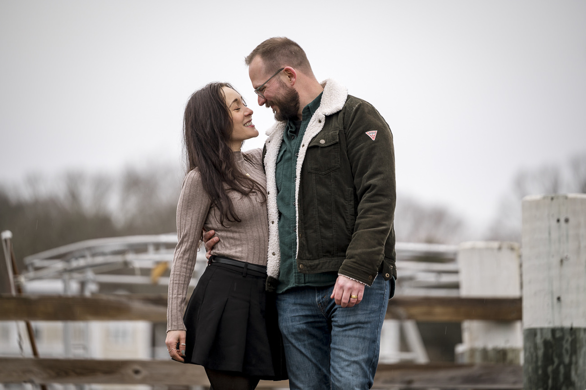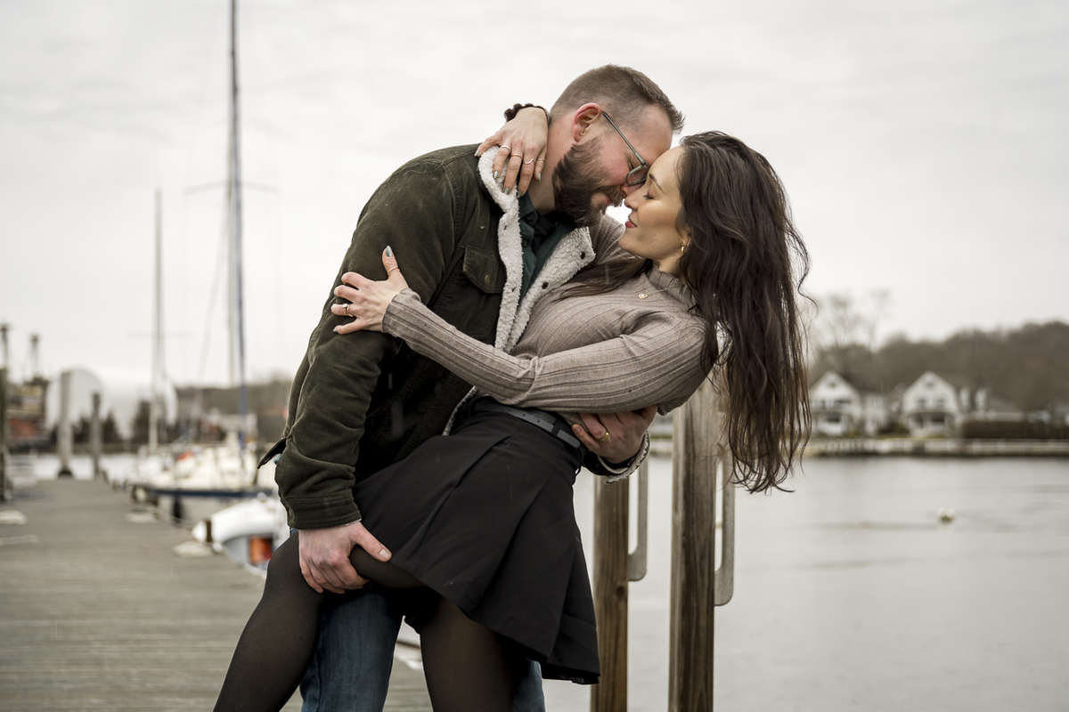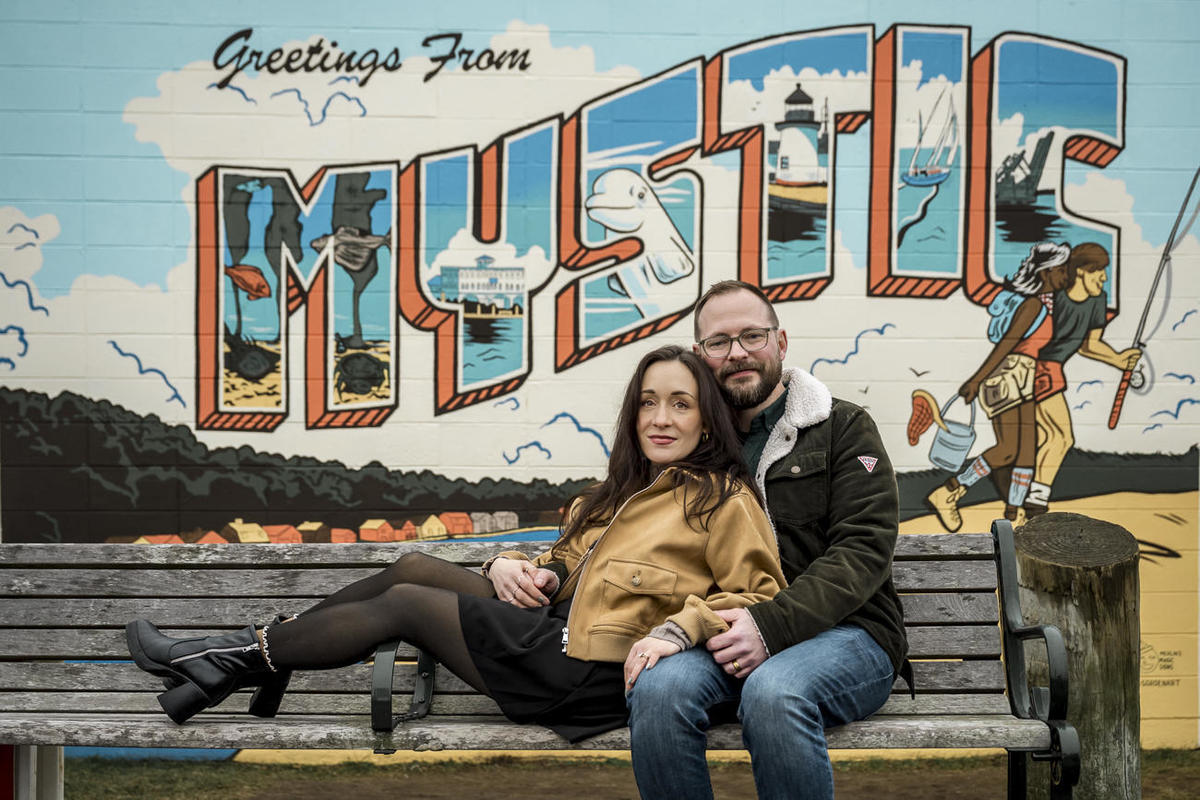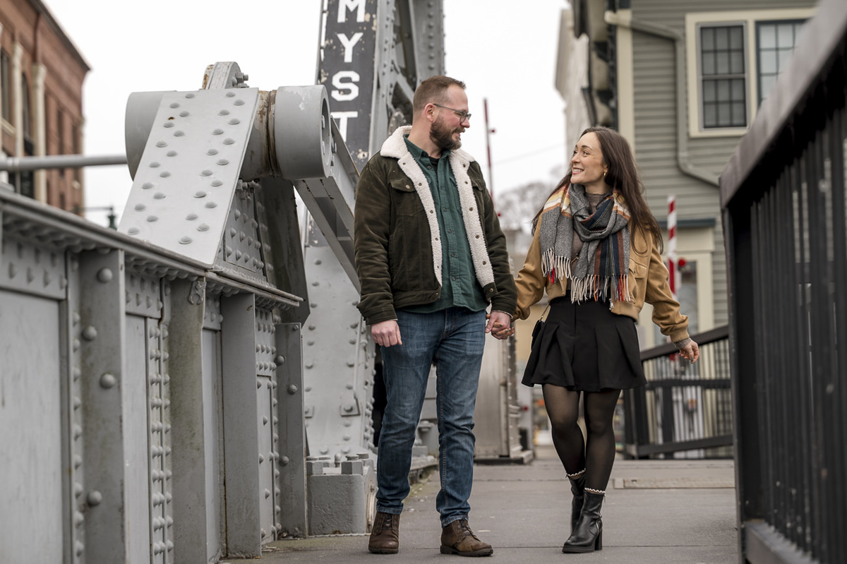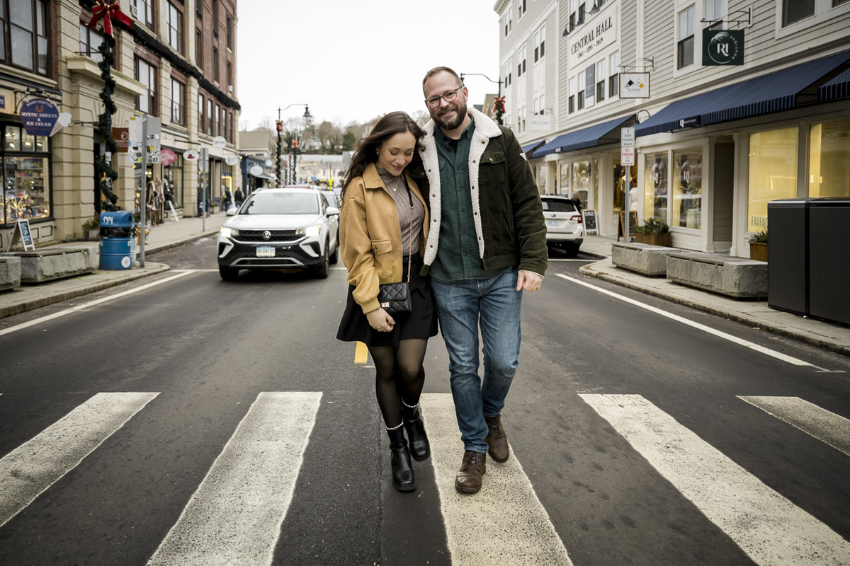 As a wedding and engagement photographer in CT, I find a unique magic in the quiet, muted tones of Mystic, CT downtown during early winter. For Amelia and Kenneth’s session, the sky was heavy with deep, moody clouds that created the perfect natural softbox for their portraits.