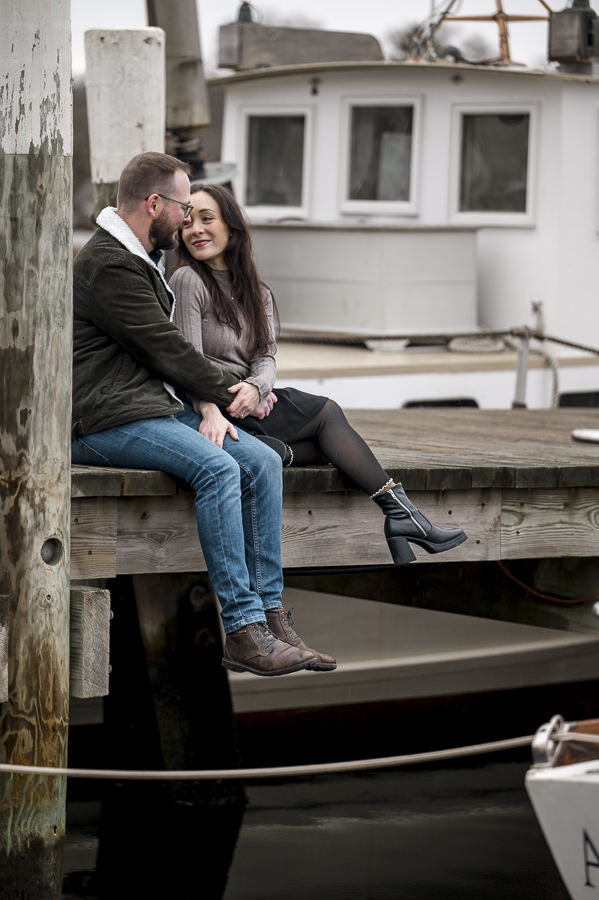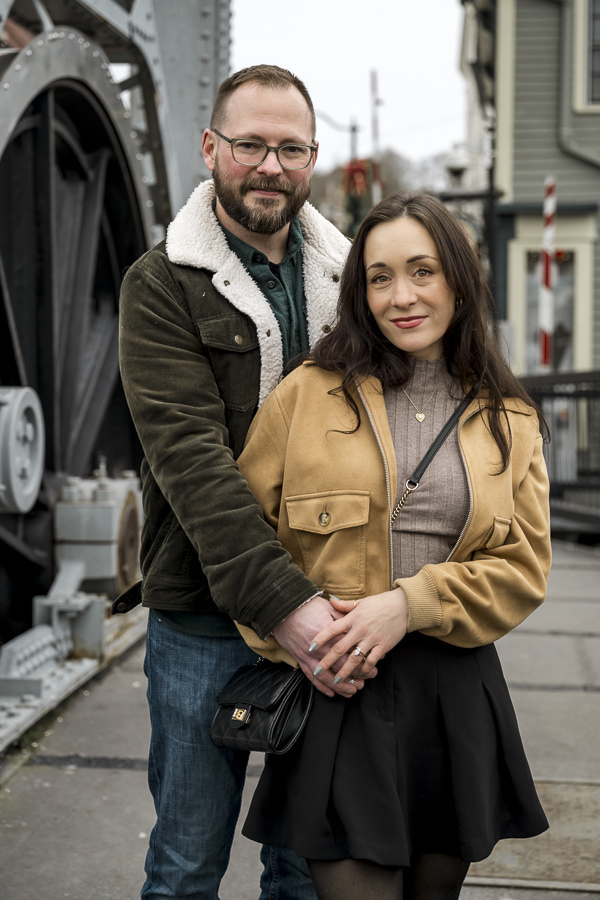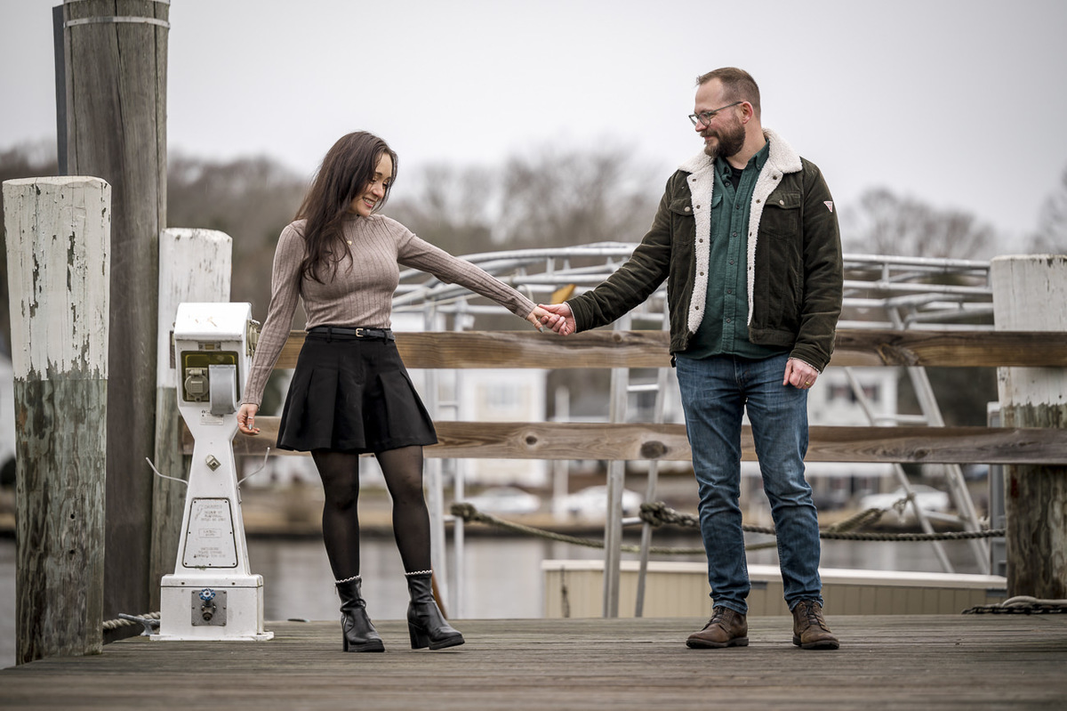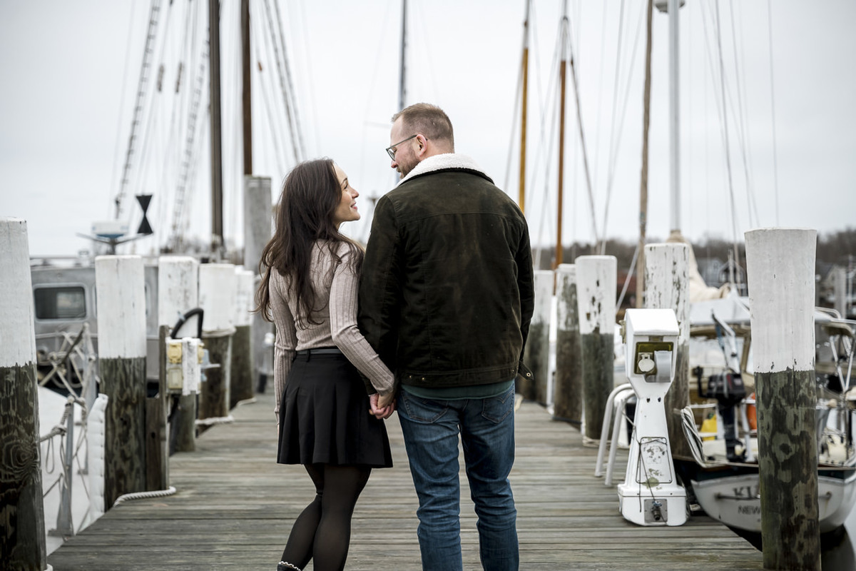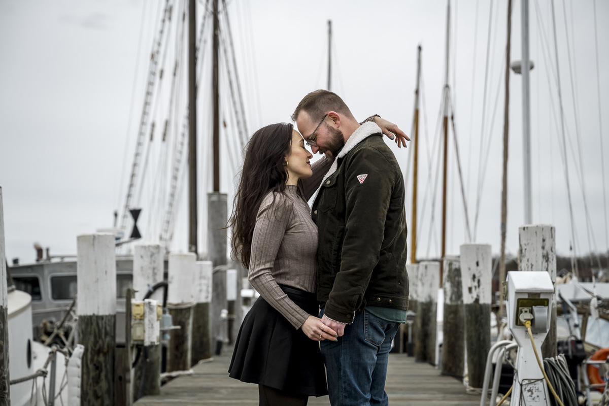 As a wedding and engagement photographer in CT, I find a unique magic in the quiet, muted tones of Mystic, CT downtown during early winter. For Amelia and Kenneth’s session, the sky was heavy with deep, moody clouds that created the perfect natural softbox for their portraits.