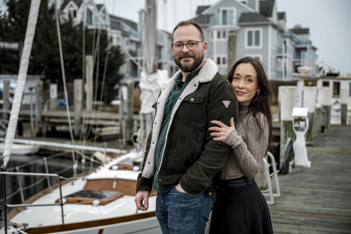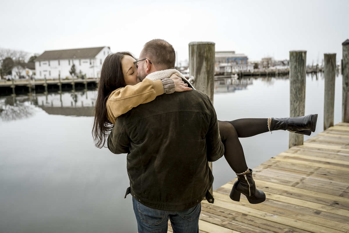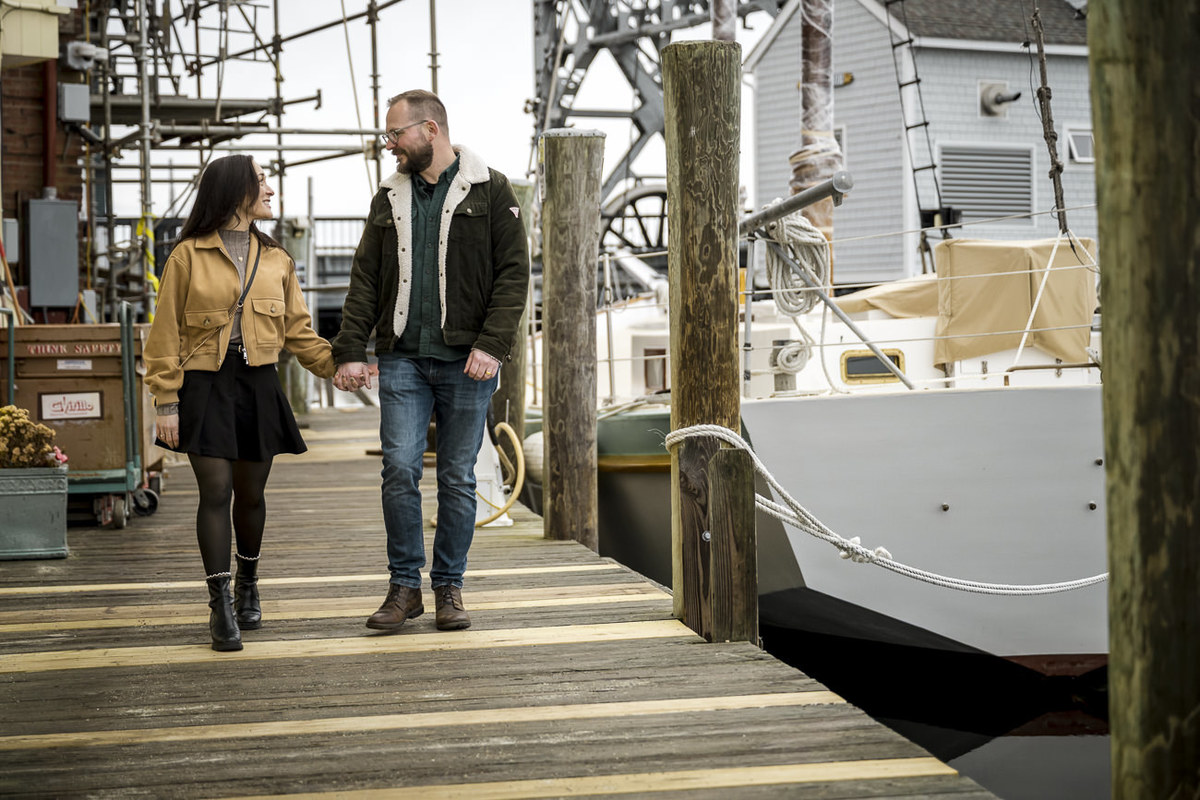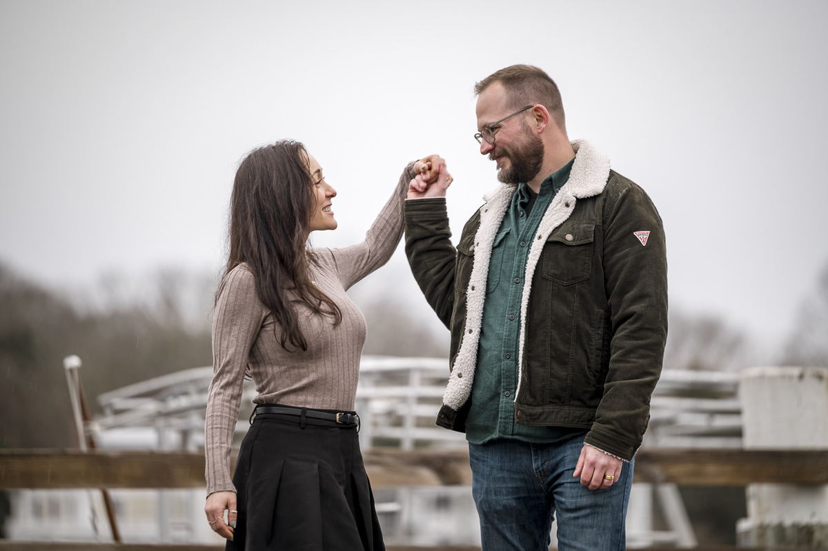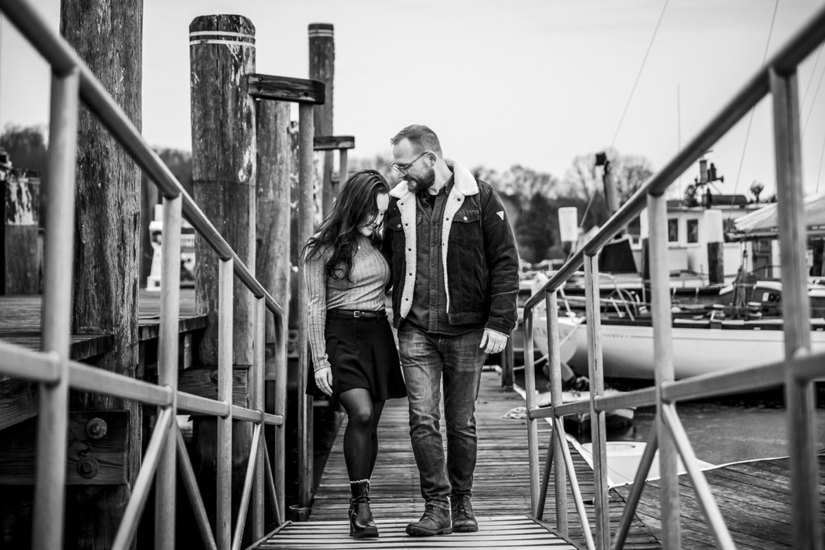 As a wedding and engagement photographer in CT, I find a unique magic in the quiet, muted tones of Mystic, CT downtown during early winter. For Amelia and Kenneth’s session, the sky was heavy with deep, moody clouds that created the perfect natural softbox for their portraits.