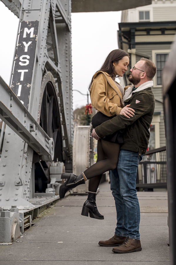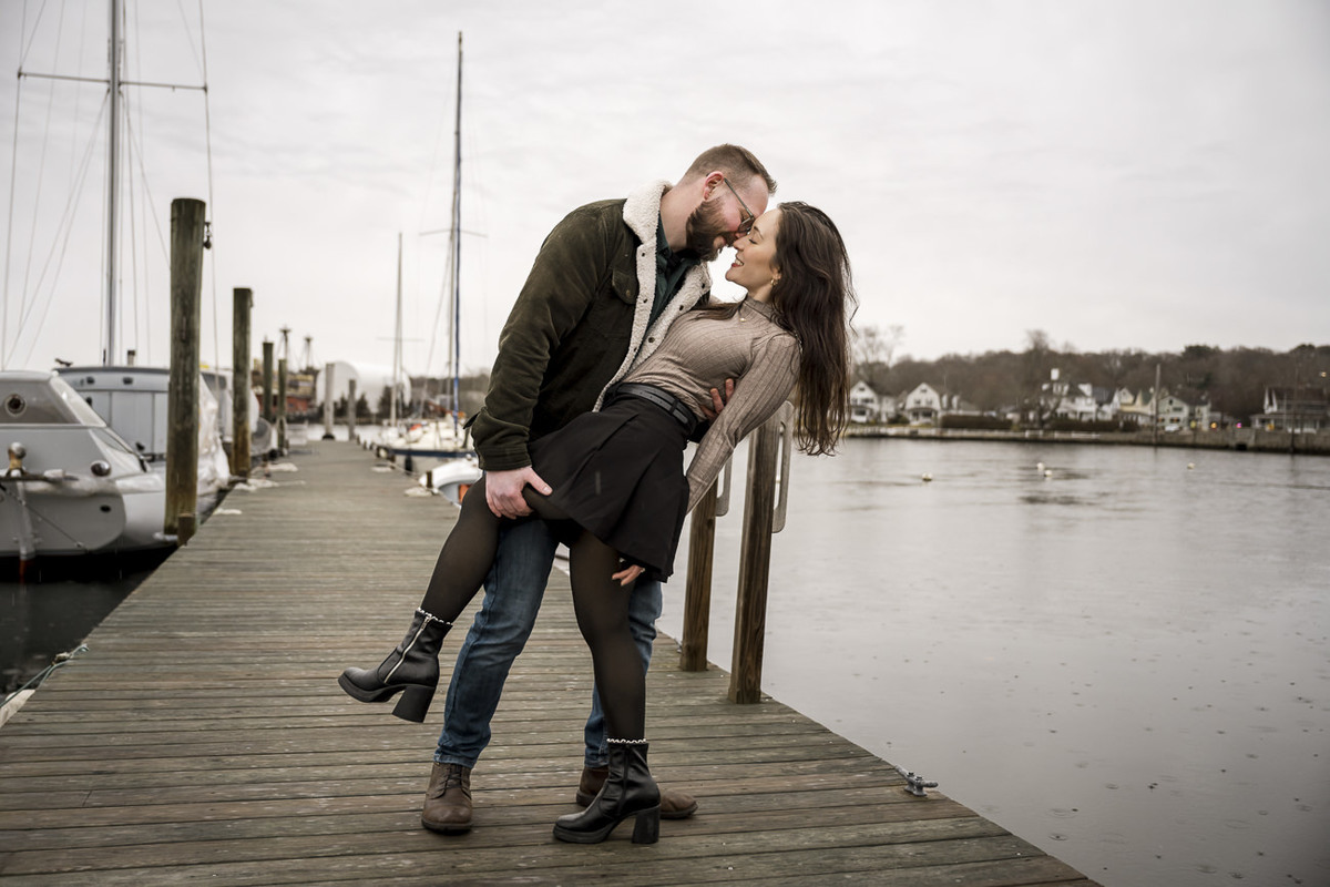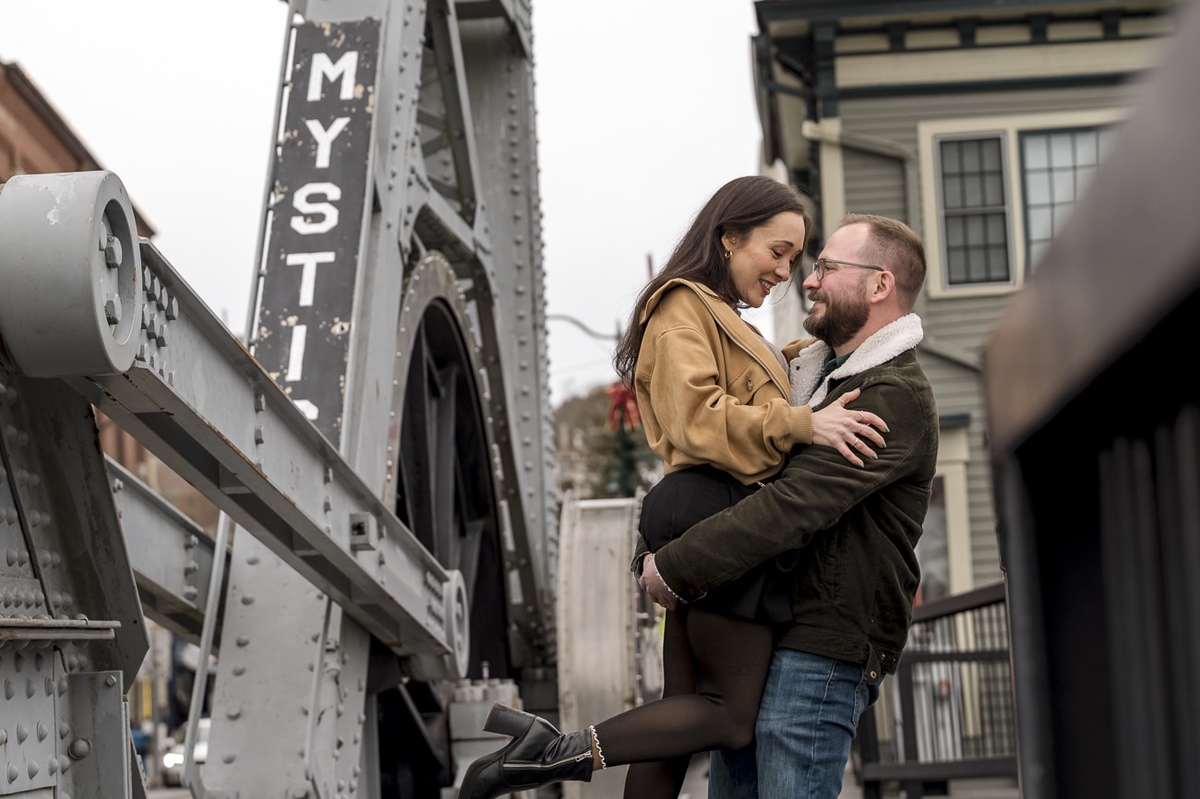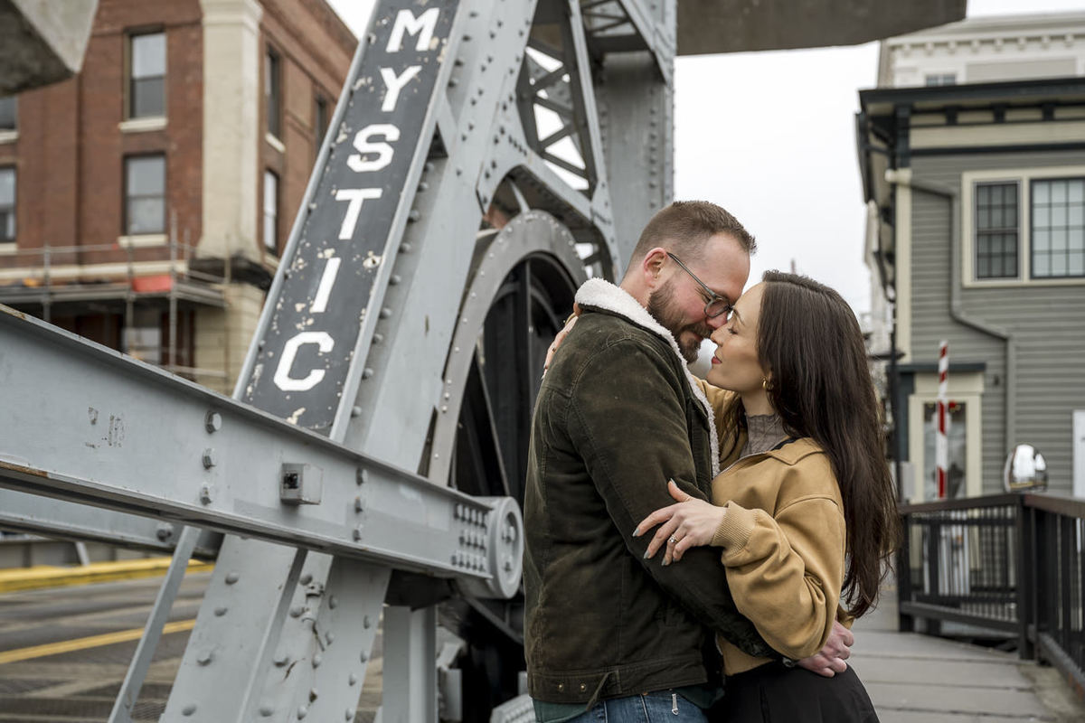Rather than letting the overcast weather dampen the mood, we leaned into the cinematic atmosphere. The lack of harsh sun allowed the historic textures of the drawbridge and the maritime docks to truly pop. As the first drops of rain finally began to fall at the very end of our session, these two remained completely focused on each other, capturing a raw, emotional energy that felt both timeless and intimate. This Mystic CT engagement proves that you don't need a golden hour to create stunning wedding photography; you just need a couple willing to embrace the elements.